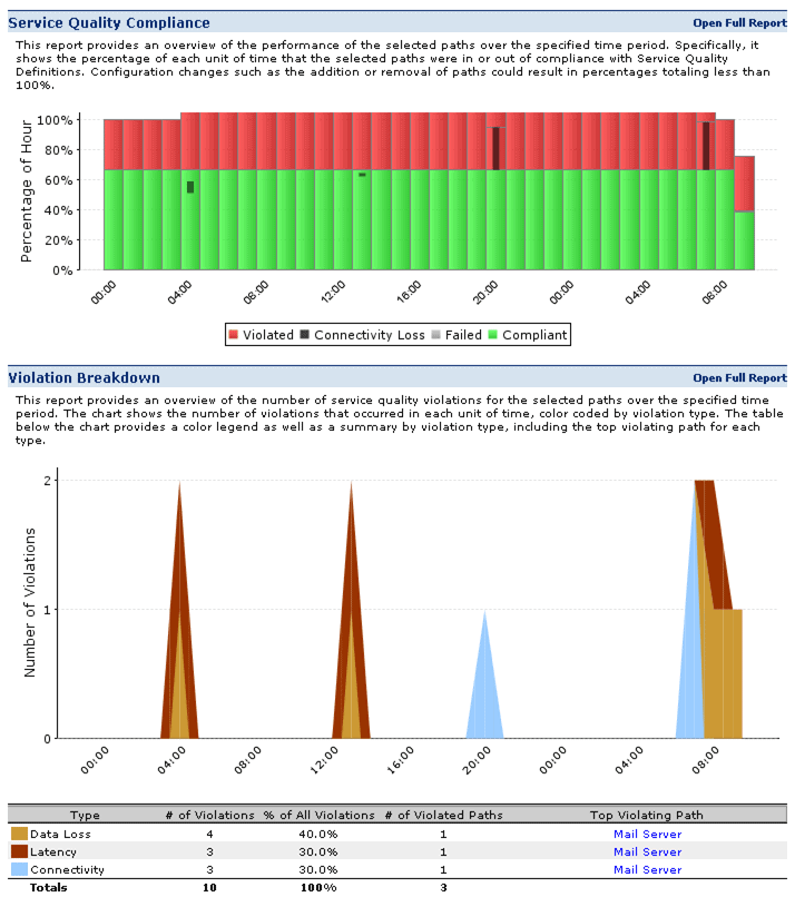 The Reporting module is basic, but provides a useful dashboard display of overall service quality, and a detailed breakdown of all service violations. A Top Offenders report also helps to identify problem paths that need attention. Reports can be exported to PDF for easy sharing.